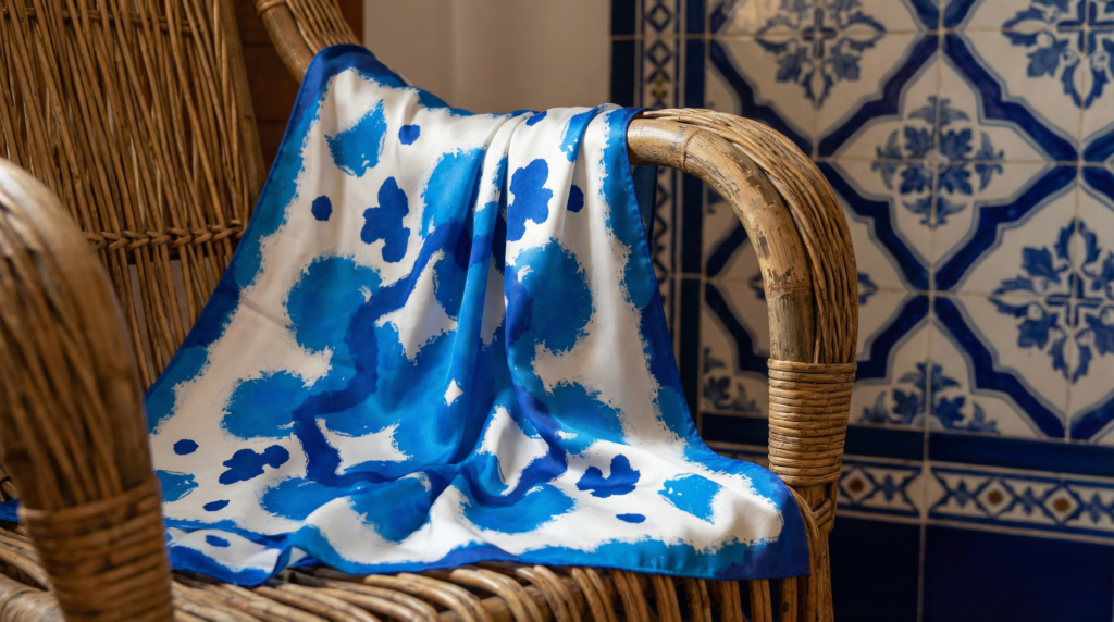«Andalusia» es un pañuelo de inspiración andaluza que nos recuerda a los típicos azulejos con los que todo andaluz se ha rodeado desde niño. Se trata de un pañuelo con un estampado estilo pintado a mano con dos tonos de azul y blanco.