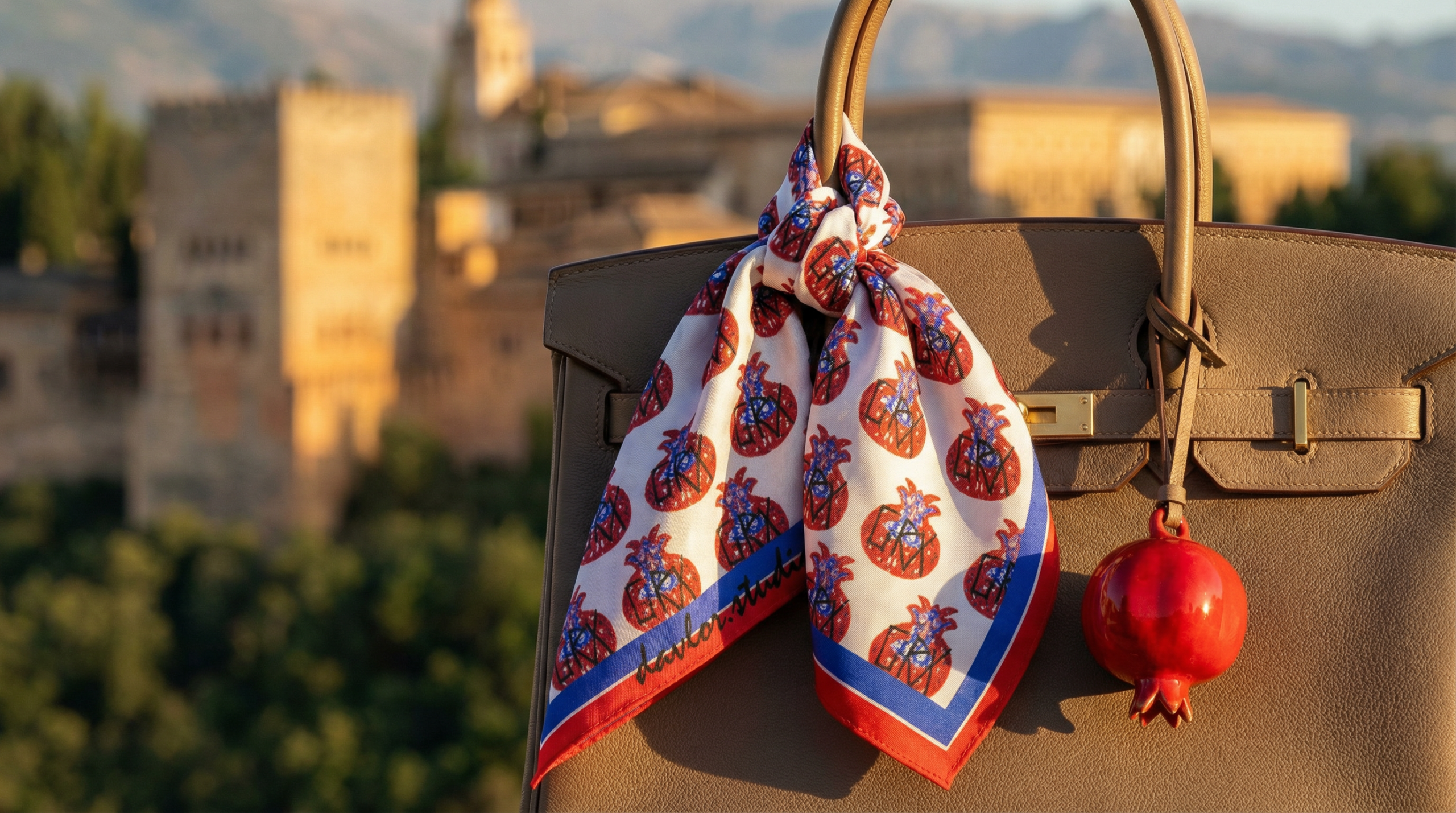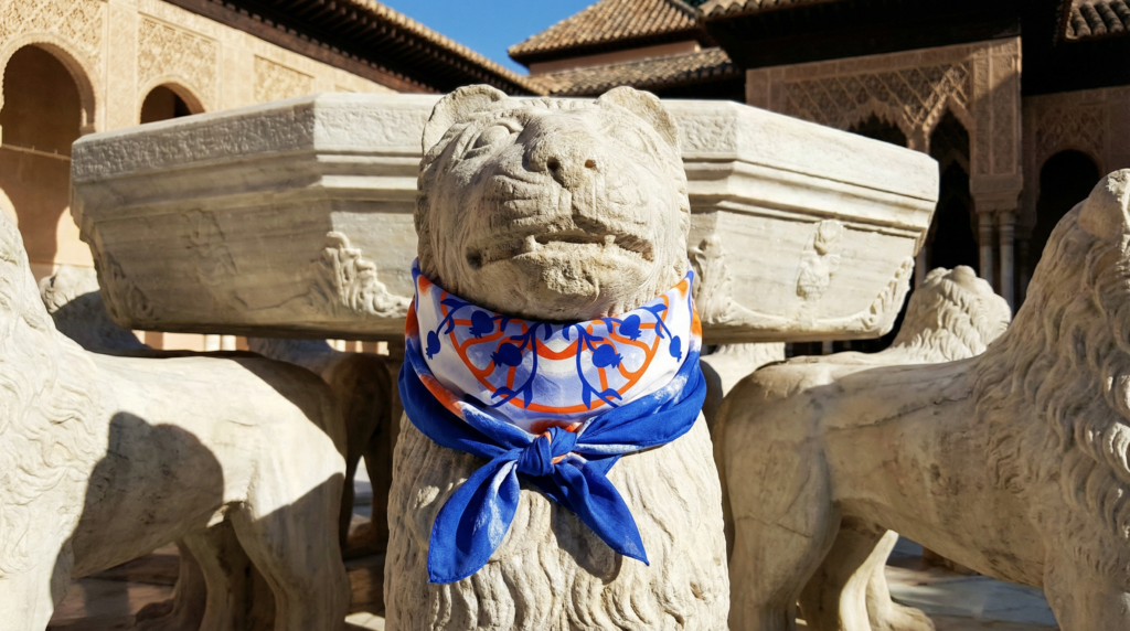 Elpañuelo «Nazarí» es una pieza con un diseño único inspirado en Granada. Este pañuelo junto a «Fajalauza» conforma una colección de dos diseños que homenajean la ciudad y su gente. Se trata de un pañuelo con colores saturados rojos y azules junto a un estampado propio conformado por granadas con elementos de azulejos en el interior y superpuesto «GRX» como se le conoce de una forma coloquial a Granada.