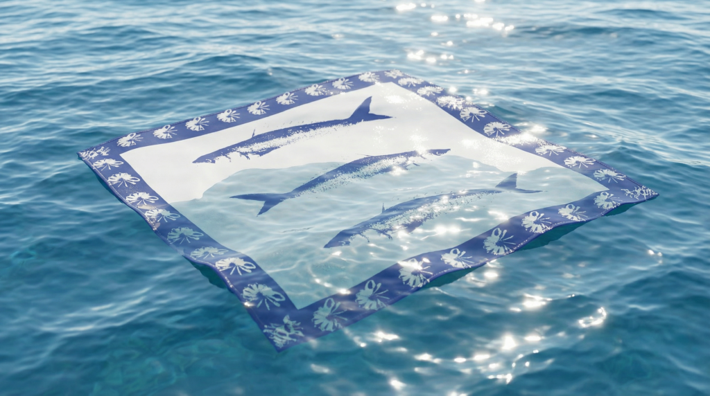 «Mediterráneo» es un pañuelo blanco con reborde azul. En el reborde hay una repetición de estampados de conchas y caracolas marinas, mientras que en el centro hay un estampado peces de número impar.