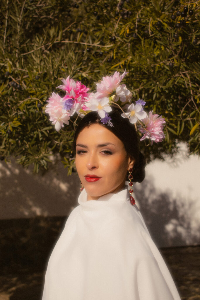 «Liebana» es un tocado florar creado para el fashion film «Santaella» inspirado en el cuadro «Retrato de Erica» del pintor Ginés Liebana. Se trata de un tocado realizado a mano con una estrucutura de alhambre y posteriormente hilado y colocado las flores.